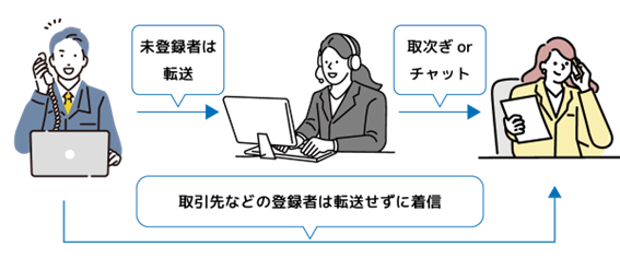 従来の「電話受付の代行」ではなく、「電話帳の登録者(取引先など)はそのまま着信」「未登録者はコールセンターで一次受付」など、着信相手ごとに異なる対応 が可能です。必要な電話のみ対応いただけます。