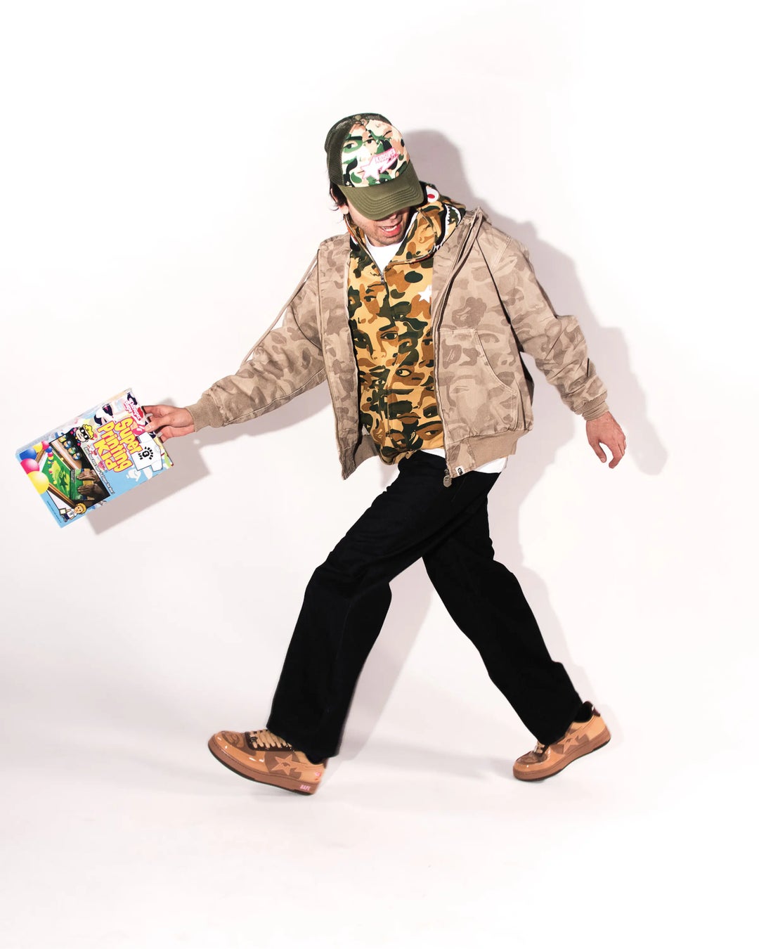 「高校時代、BAPE STORE®︎の行列に並ぶ人々に向けてTシャツを売っていたことがありました。友人の地下室でBAPE®︎のブートレグシャツを作ったこともあります。それから15年後、BAPE®︎と正式にコラボレーションするという夢が現実になりました。BAPEと®︎の仕事は、子どもの頃に思い描いた夢が叶った瞬間です。商品を手に取ったとき、その感動を共有できたらうれしいです。」