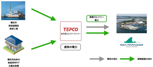 横浜市内の家庭から出されるゴミの焼却と、市内の家庭による太陽光発電で作られる地産地消の再生可能エネルギーを水族館運営で活用させていただいております。
