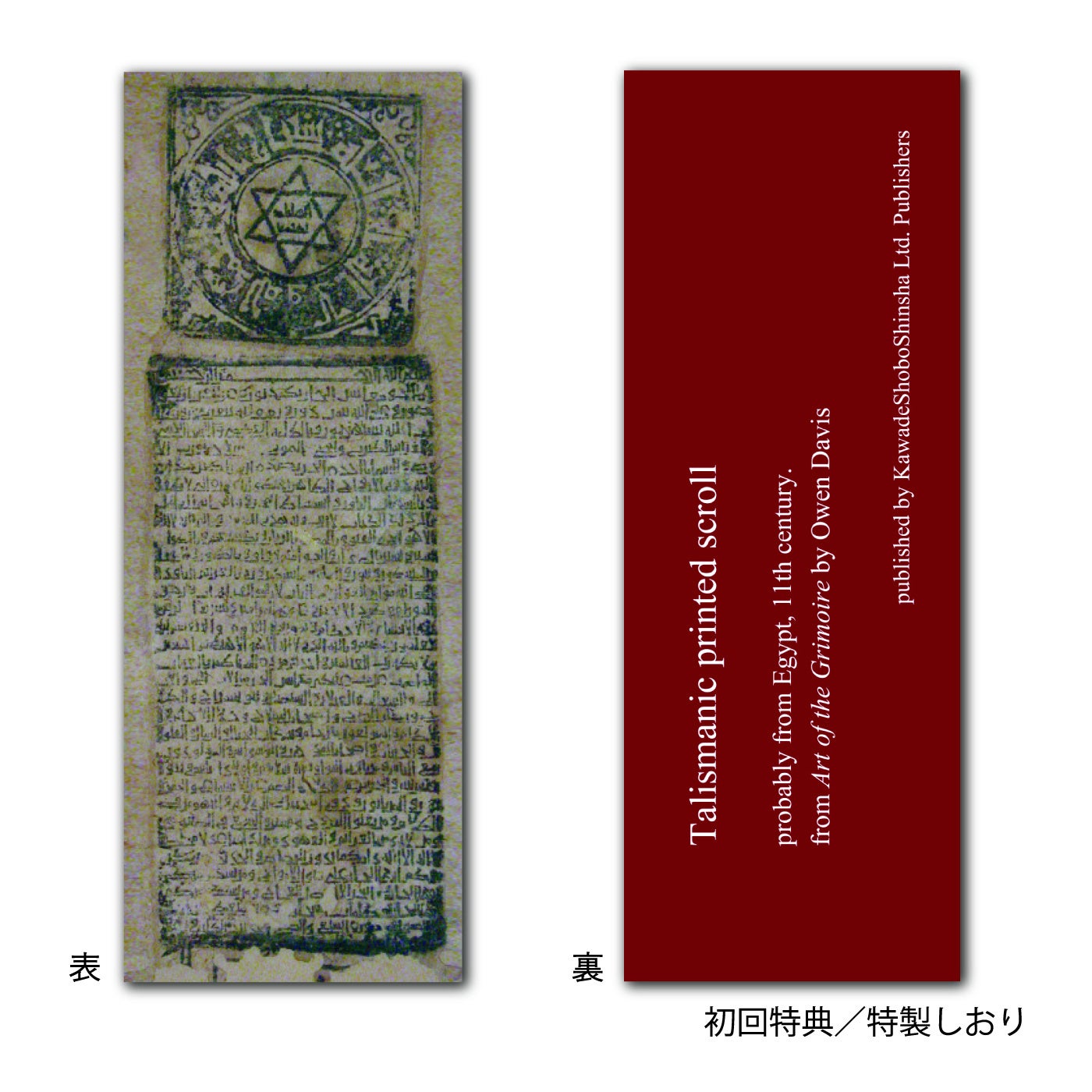 2024年4月1日のプレスリリース(https://prtimes.jp/main/html/rd/p/000000614.000012754.html)以降、お客様や書店様からの本書への予約申し込みが殺到しております。そこでこの度、反響の大きさと読者の皆様のご期待にお応えしたいと、急遽、初回配本限定の特典「特製しおり」をおつけすることといたしました。「特製しおり」は、本書P.98に掲載の六芒星が描かれた中世エジプトのお守りで、これを印刷し、しおり状にしたものです。本文によると、お守りは、初期のアラビア書道に用いられ、コーランを写すのに好まれたクーフィー体で書かれており、人々はこのようなお守りを何度も小さく折り畳み、小さなケースに入れて持ち歩いたと伝わっています。本書と併せ、発売を楽しみにお待ちいただきたく思います。