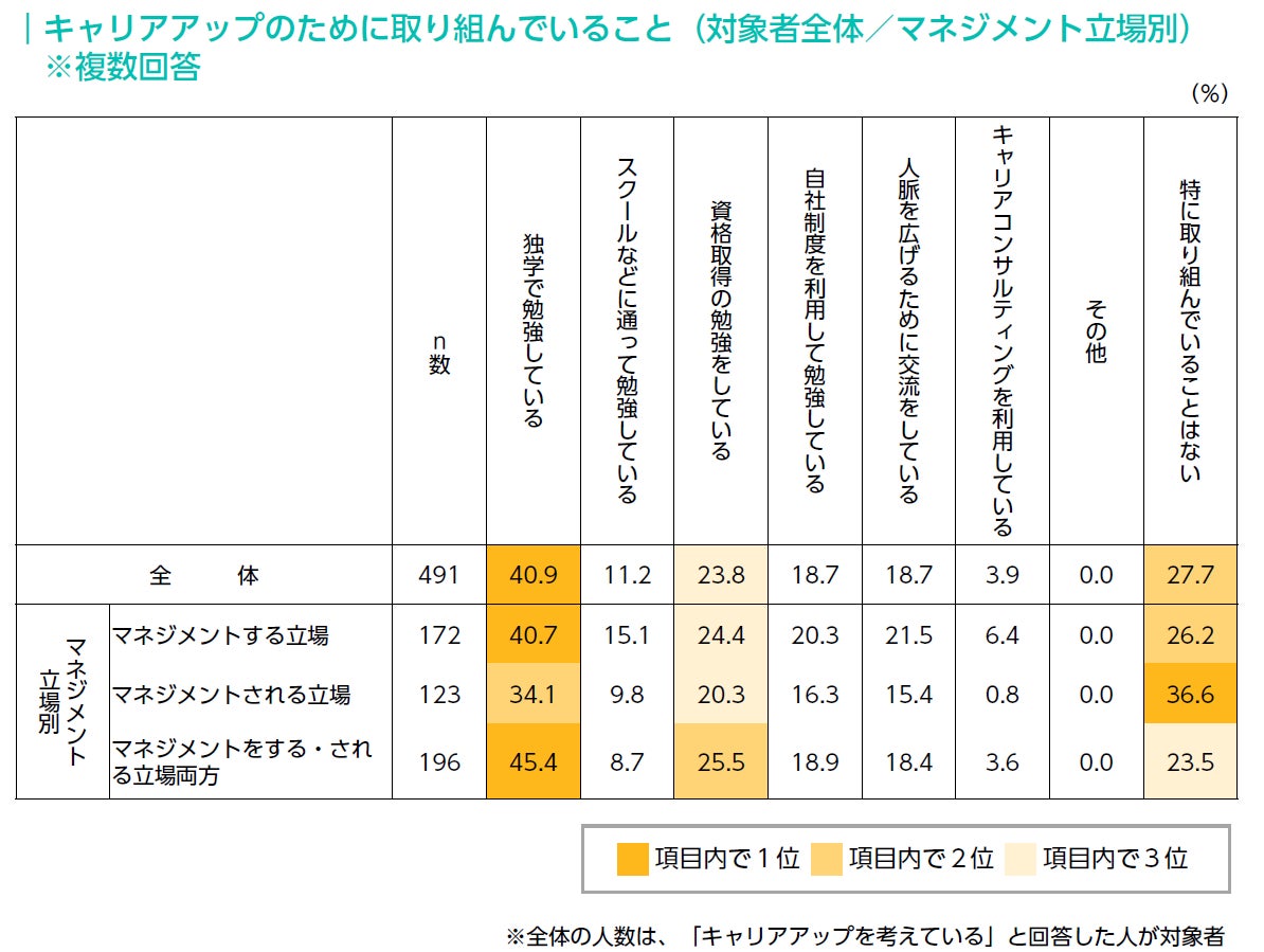 キャリアアップのために取り組んでいることとして、「独学で勉強している」人が対象者全体の40.9%を占める。一方、「マネジメントされる立場」は、キャリアアップを考えつつも「特に取り組んでいることはない」人も多いが、「マネジメントする・される立場両方」の層は何かに取り組んでいる傾向が強く、「独学で勉強している」「資格取得の勉強をしている」割合が全体平均より高いことがわかった。