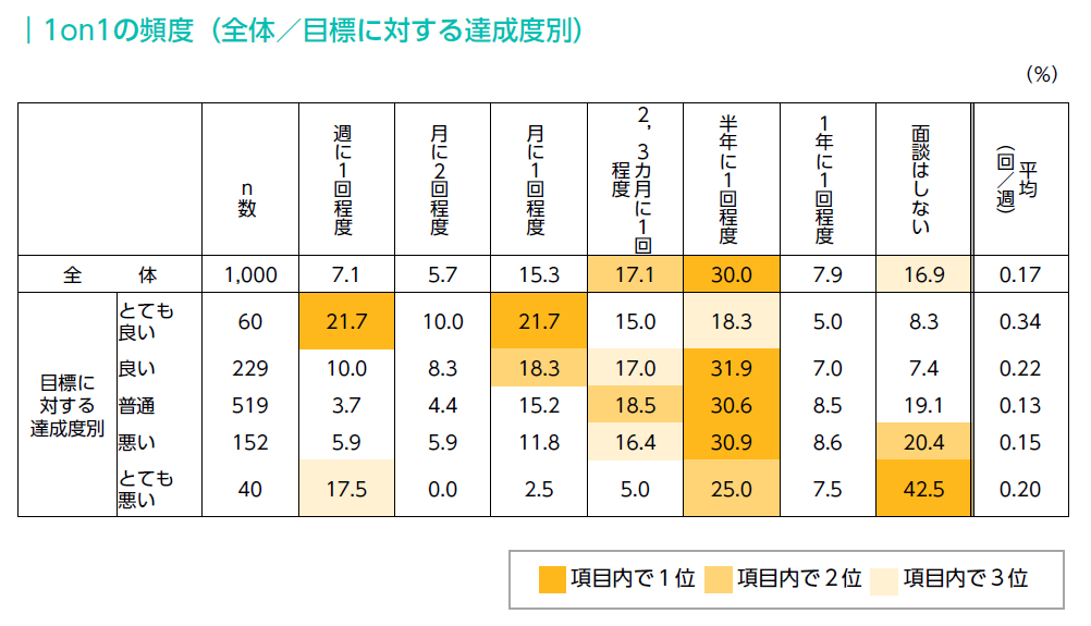 1on1の頻度について、全体では「半年に1回程度」が最も多く30%を占めた。一方、目標に対する達成度(パフォーマンス)が「とても良い」職場では「週に1回程度」と「月に1回程度」の割合が高く、「とても悪い」職場では「面談はしない」割合がトップとなった。