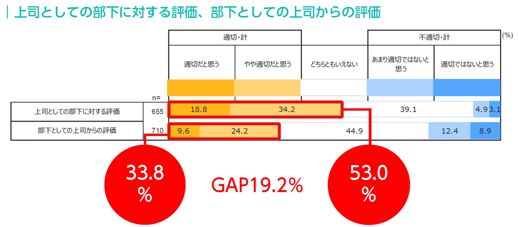 部下に対する評価が適切だと思っている上司は53.0%。一方、上司からの評価を適切だと思っている部下は33.8%で、19.2%のギャップがあった。