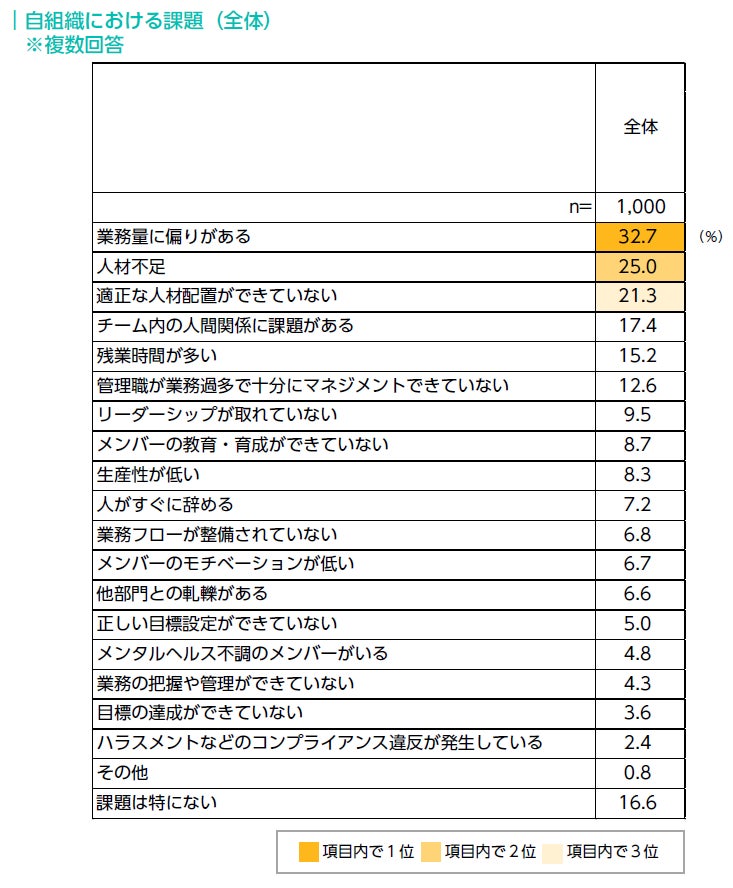 自組織における課題について、全体では「業務量に偏りがある」、「人材不足」、「適正な人材配置ができていない」が上位課題となった。
