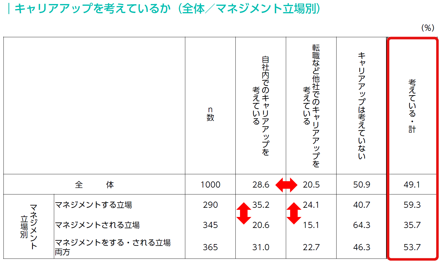 自社内または転職でのキャリアアップを考えている人は全体の半数程度となった。「考えている」人のうち、自社内でのキャリアアップを考えているのが28.6%に対し、転職など他社でのキャリアアップを検討している人も20.5%程度いることがわかった。マネジメント立場別に見えると、「マネジメントする立場」の方が「マネジメントされる」立場よりも、キャリアアップを考えている割合が高い。