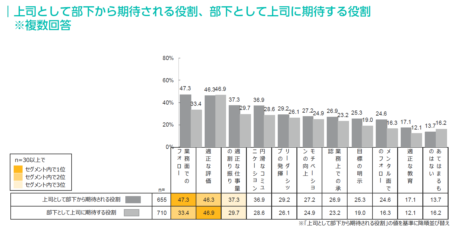 上司として部下から期待する役割として、第1位に「業務面でのフォロー」、第2位に「適正な評価」があがったが、部下として上司に期待する役割としては順番が逆転し、「適正な評価」が1位となった。