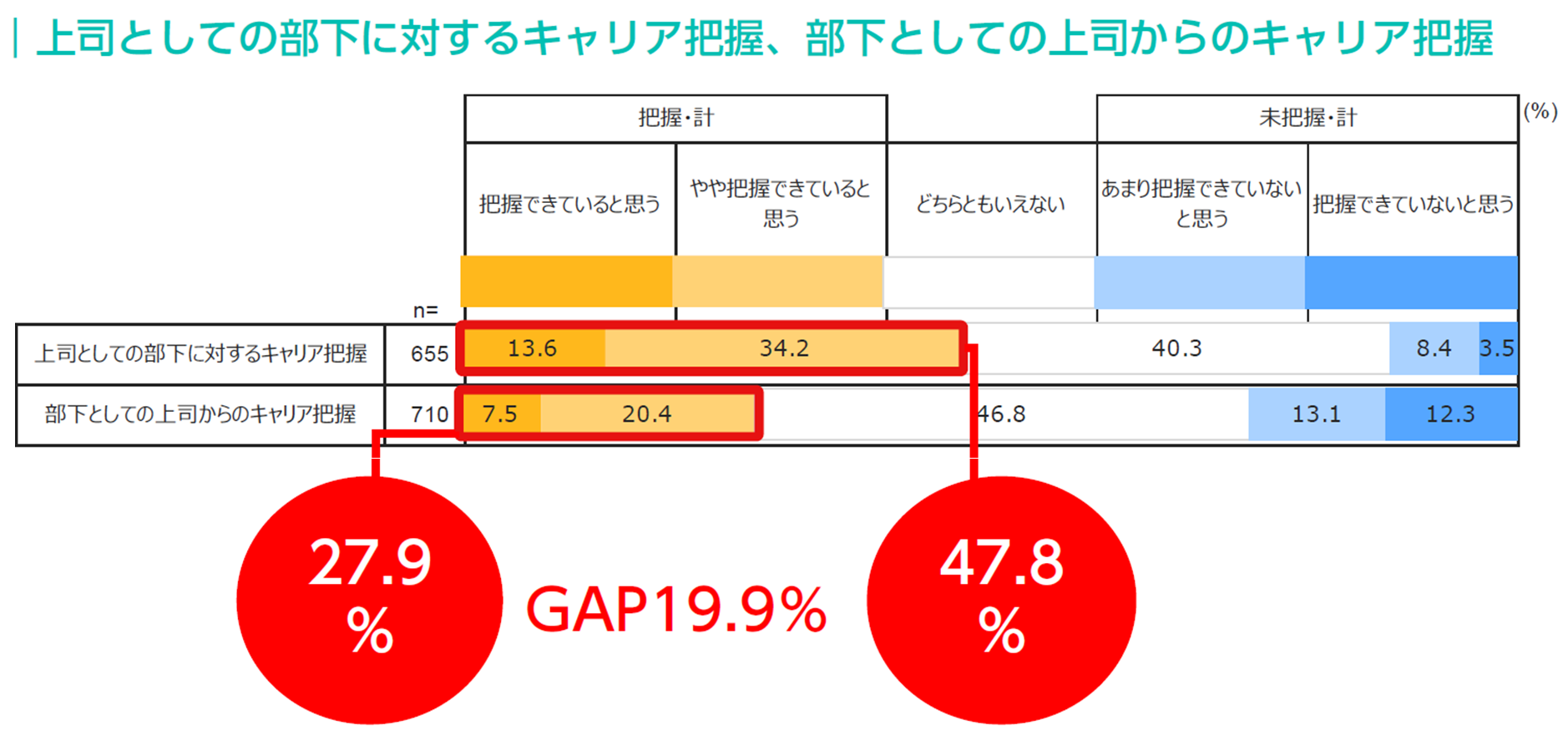 て上司からのキャリア把握ができていると思う人は27.9%で、19.9%と本調査の上司と部下の認