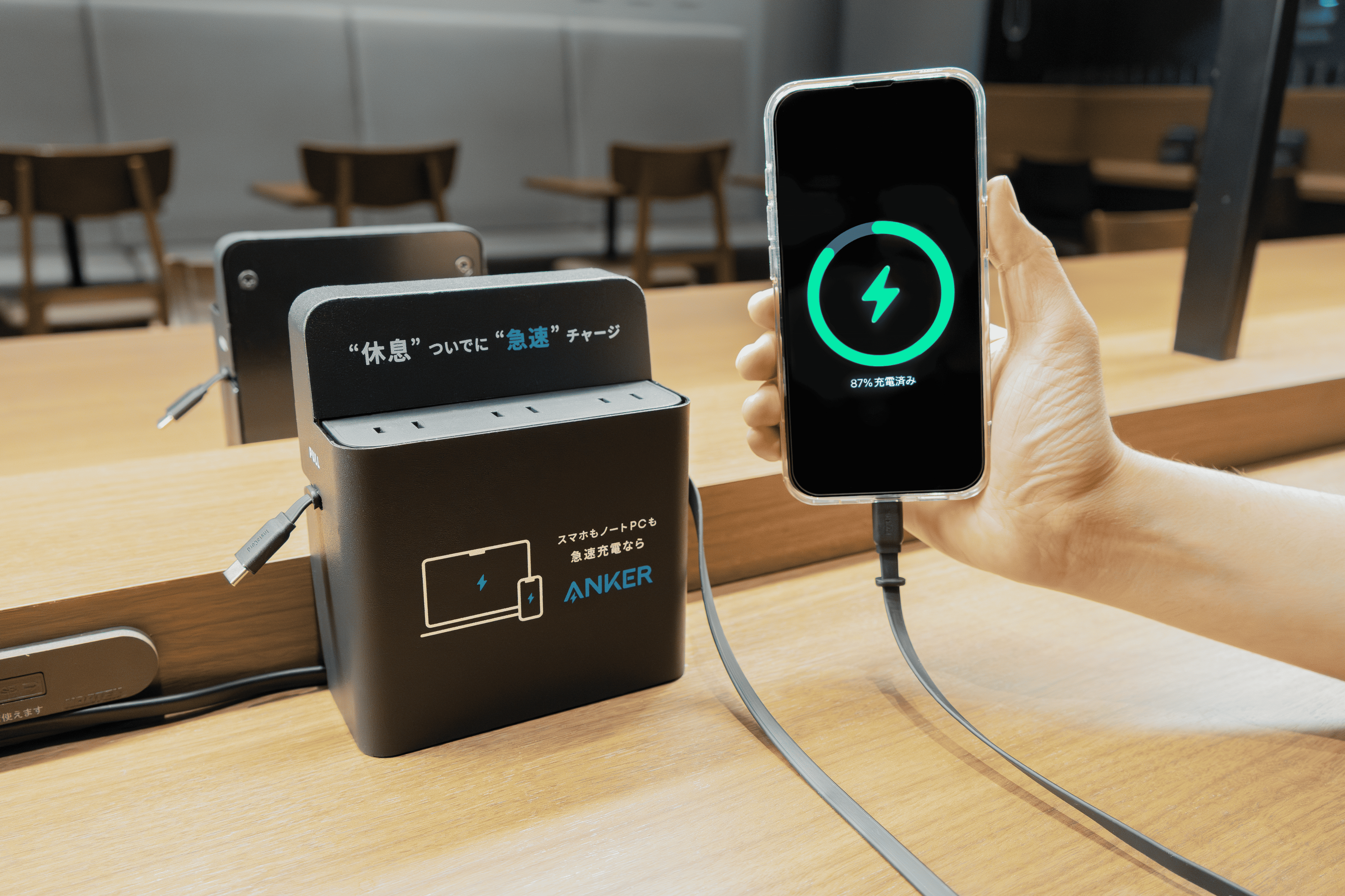 アンカー・ジャパンは、お客様にAnkerグループ製品によるスマートで豊かな暮らしをお届けできるよう、日常を過ごす中での接点となりやすいタクシー車内やホテル、飲食店、空港施設等、幅広い箇所に充電スポットを設置して参りました。また、2025年5月からは自社運営のカフェ「Anker Cafe」を展開し、コーヒータイムやランチ時間にもスマートフォンやノートPCを急速充電できる環境をご提供しています。この度、このAnker Cafeでの取り組みを起点として、飲食空間での快適かつスマートな充電環境の整備を加速させるべく、タリーズコーヒーとのコラボレーション店舗として「タリーズコーヒー 赤坂トラストタワー店 Powered by Anker」を2026年3月30日(月)にオープンします。本店舗では全席にAnkerの巻取り式USB-Cケーブルを設置するだけでなく、スマートフォンを置くだけでマグネット式ワイヤレス充電が可能なAnkerオリジナルのテーブルも設置いたします。