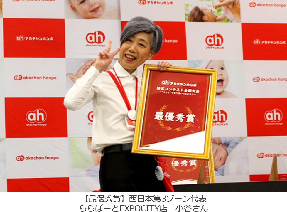 栄えある「最優秀賞」に輝いたのは、西日本第3ゾーン代表 ららぽーとEXPOCITY店の小谷さん。マタニティアドバイザーとして活躍する小谷さんの実演ではお客さまに寄り添う姿勢、ユーモアと笑顔あふれる接客が評価されました。