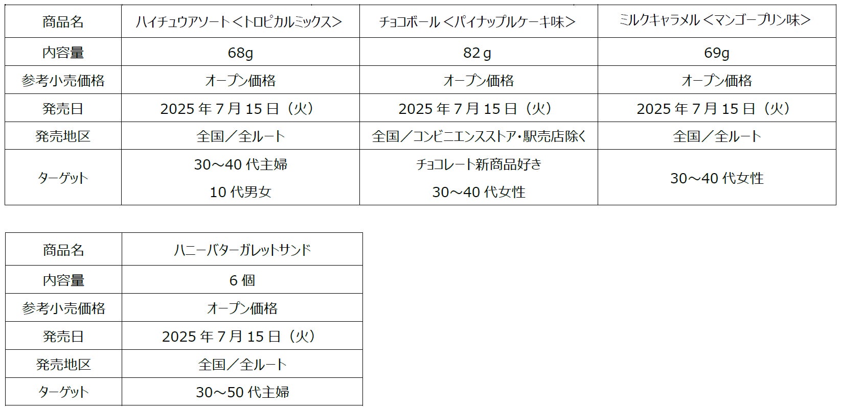 「ハイチュウアソート<トロピカルミックス>」では、台湾で発売されているトロピカルフルーツ、「チョコボール<パイナップルケーキ味>」では、台湾のお土産のパイナップルケーキ、「ミルクキャラメル<マンゴープリン味>」では、香港で定番のマンゴープリンの味を再現しました。また、「ハニーバターガレットサンド」は、韓国で人気のハニーバター風味のガレットサンドに仕立てています。