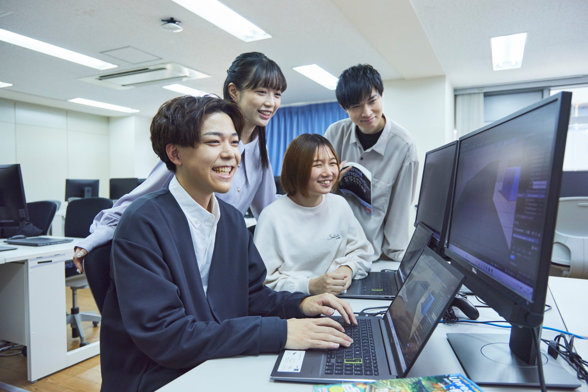 AMGグループが持つ、企業との太いパイプにより「産学共同・現場実践教育」を実現、コンテンツ制作の現場を在学中から経験し、技術や意識を学ぶだけでなく、就職やデビューに活かす体制を整えています。