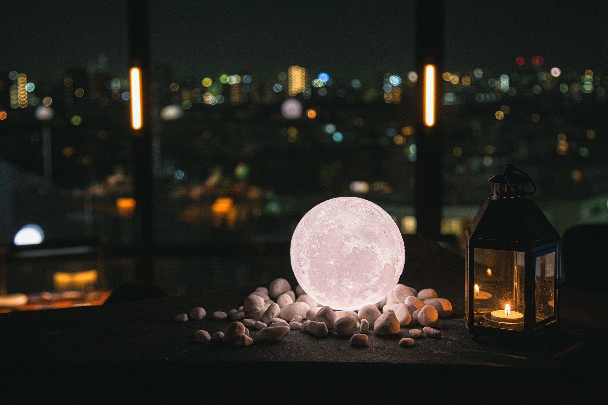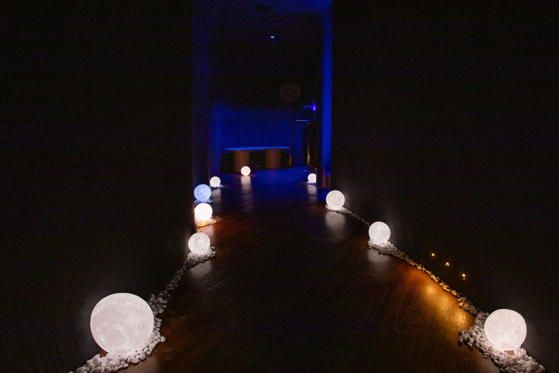 エレベーターを降りてすぐ、洞窟に並ぶ月灯りに誘われて夜景が広がる店内へ。