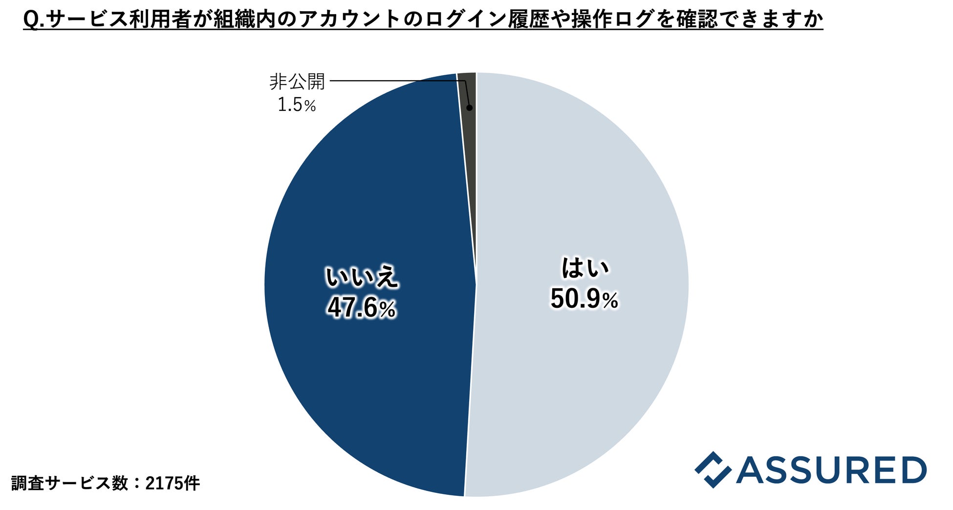 約半数の50.9%のクラウドサービスで、サービス利用者が組織内のアカウントのログイン履歴や操作ログを確認できないという結果になりました。