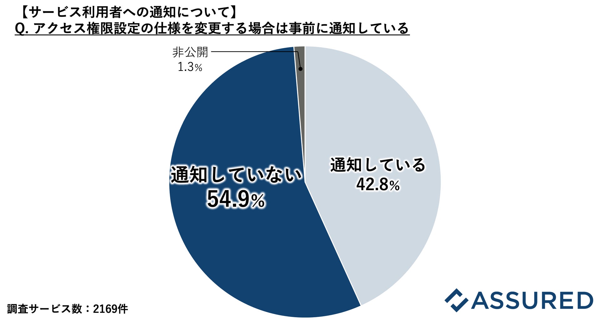半数以上にのぼる54.9%のクラウドサービスが、アクセス権限設定の仕様を変更する場合の事前通知を実施していないという結果になりました。アクセス権限が知らない間に拡大されるような変更は昨今考えにくいですが、新たなアクセス権限ができることでより詳細なアクセス権限が設定可能となる仕様変更は多いと想定されます。