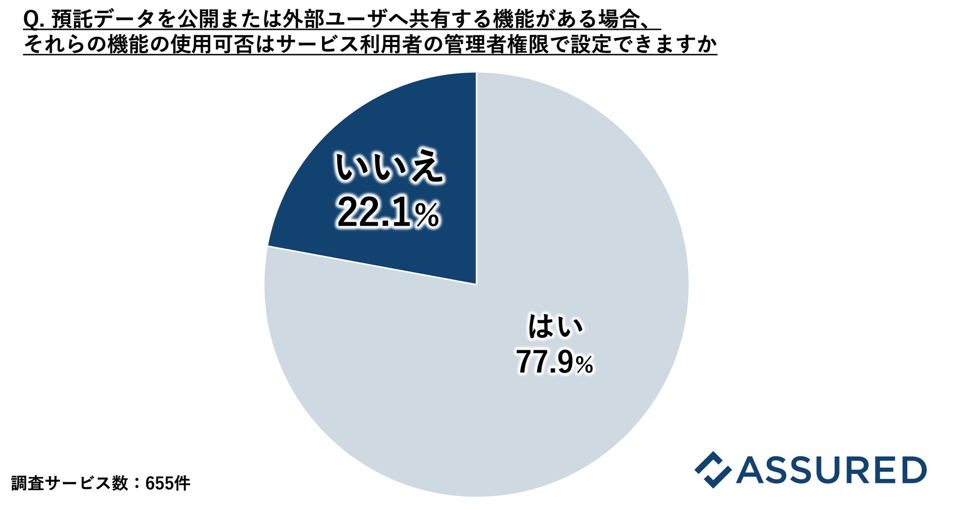 預託データを公開または外部ユーザへ共有する機能があると回答したクラウドサービスの内、22.1%が外部公開機能の使用可否をサービス利用者の管理者権限で設定ができないという結果になりました。