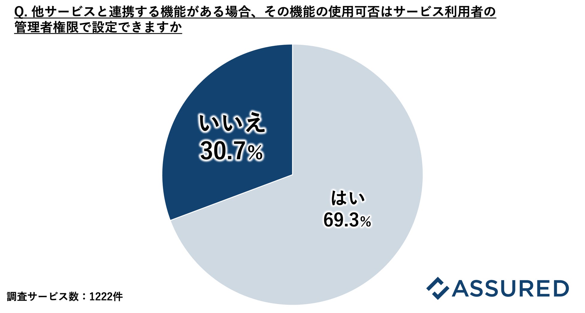 他サービスと連携する機能があると回答したクラウドサービスの内、30.7%が他サービスとの連携機能の使用可否をサービス利用者の管理者権限で設定ができないという結果になりました。