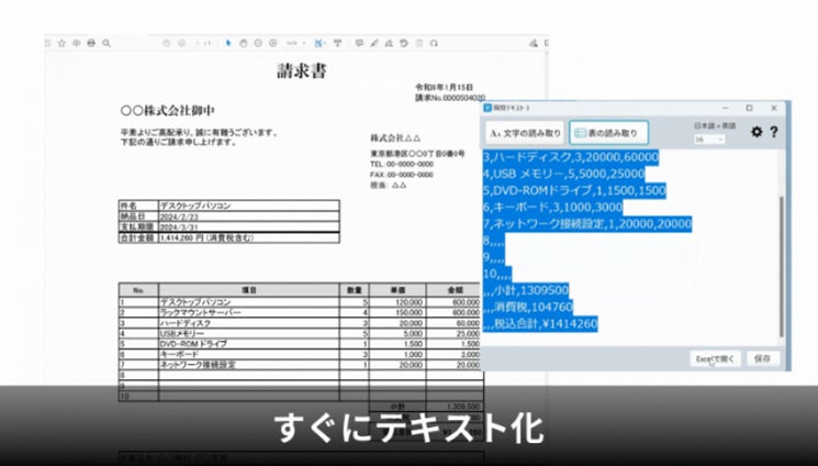 読み取った表組みはCSV形式でも保存でき、さまざまなシステムで活用できます。 |