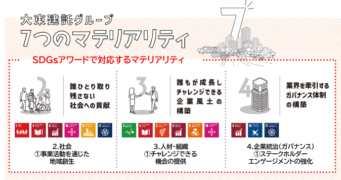 今後も当社グループが地域社会のためにできることを探求し実践する、こうした活動を継続することで、企業活動を通じたサステナビリティ推進を実践するとともに、当社グループが特に重点的に取り組むべき課題として特定した「大東建託グループ 7つのマテリアリティ(重要課題)」への対応を促進し、社会に不可欠な企業として成長することを目指します。