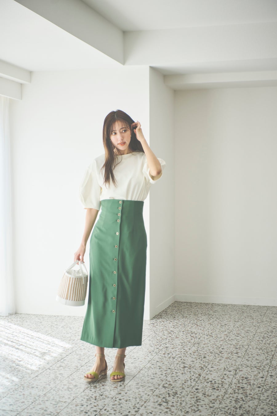 グリーンのタイトスカートですっきりしたIラインをメイク