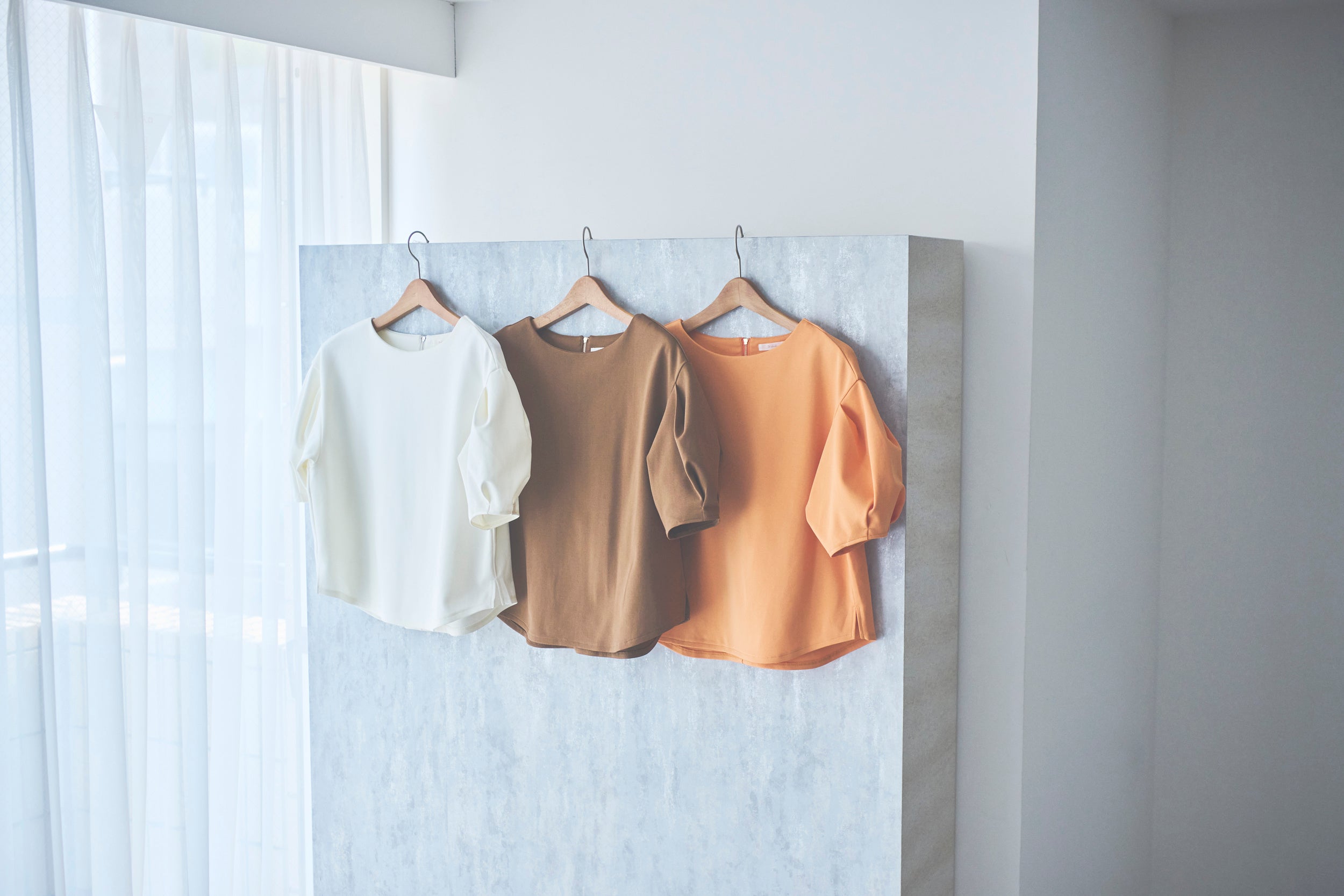 今回は、トレンド要素を盛り込んだスリーブデザインのカットソー3型をご用意いたしました。スリーブのデザインは、タック使いが印象的なバナナスリーブやほどよい透け感のシアースリーブ、バルーン型のボリュームスリーブをセレクト。どんな骨格タイプの方にも楽しんでいただけるように、袖のシルエットや丈感、身頃とのバランスにこだわった特別なアイテムです。カラー展開は、オフィスで活躍するベーシックカラーに加え、初夏の装いにもぴったりな鮮やかなカラーもラインアップ。ブラウス見えする上品な素材を使用し、接触冷感とUVカット機能も備わった、万能なアイテムに仕上がりました。