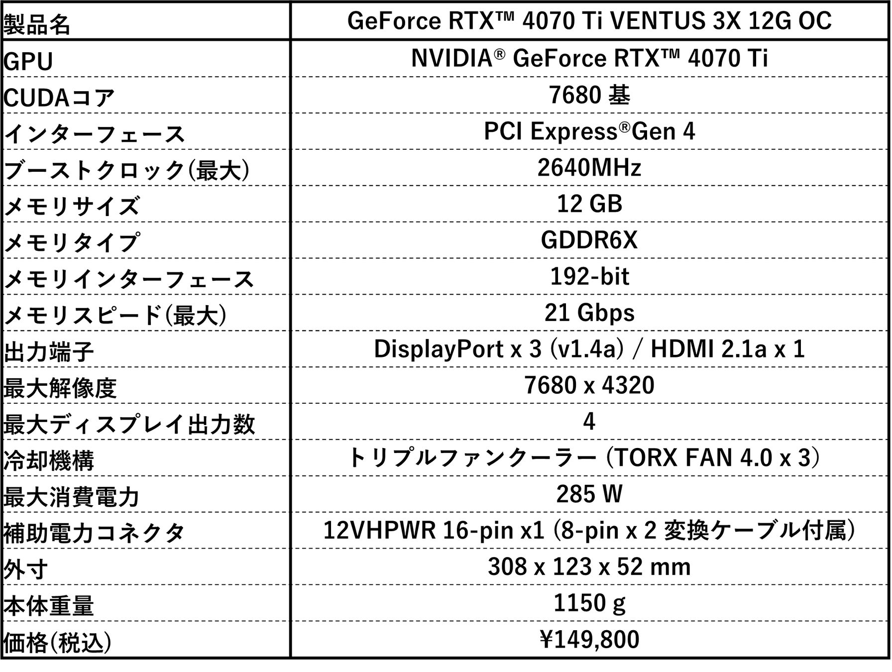■GeForce RTX™ 4070 Ti VENTUS 3X 12G OChttps://jp.msi.com/Graphics-Card/GeForce-RTX-4070-Ti-VENTUS-3X-12G-OC