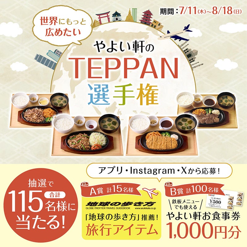 このたび日本国内の「やよい軒」では、「やよい軒」公式アプリ・X(旧Twitter)・Instagramにおいて、「やよい軒」世界共通フェア『TEPPAN FAIR(鉄板フェア)』を記念して“「やよい軒」のTEPPAN選手権プレゼントキャンペーン”を実施いたします。