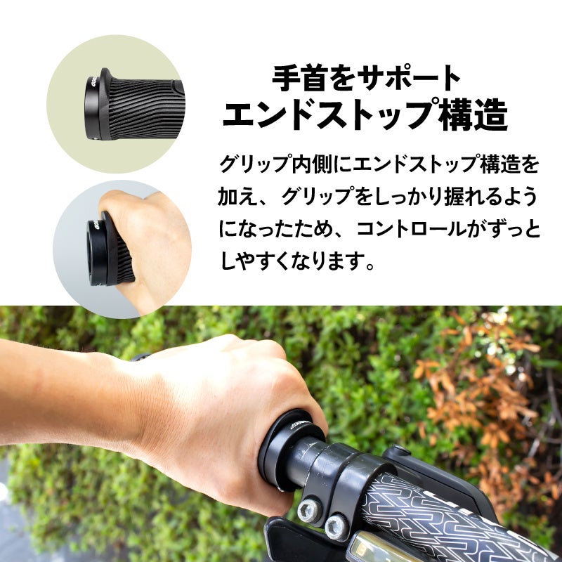 グリップ内側に作られた珍しいエンドストップ構造は、手首のサポートと操作性を向上させます。クロスバイクやマウンテンバイク、ミニベロ、小径車などのフラットハンドルのグリップ交換に最適です。