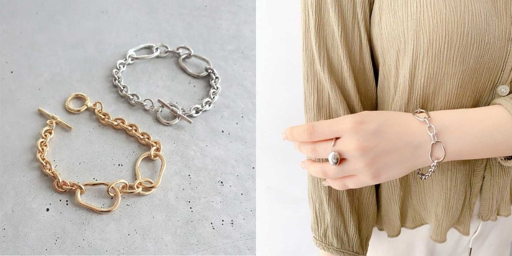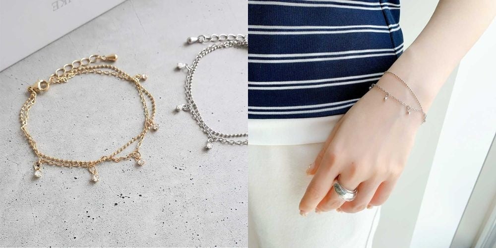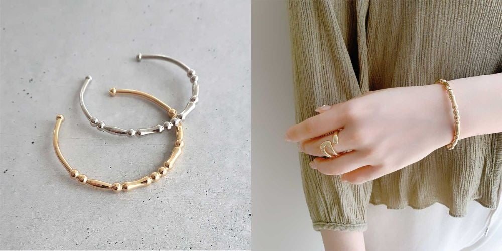 シンプルなメタルカラーなので単品使いはもちろん、重ね付けをして手元を華やかに仕上げるのもおすすめです。