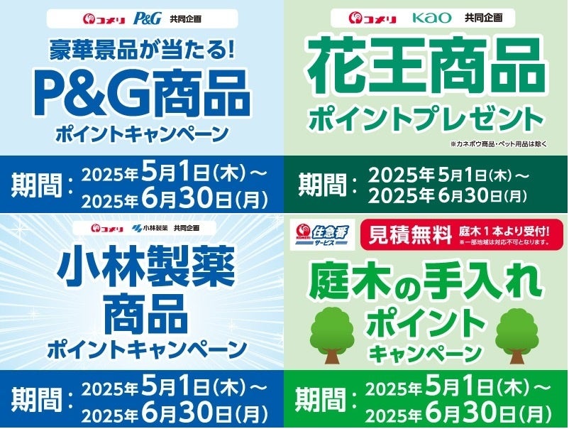 ホームセンターの「コメリパワー」や「コメリハード&グリーン」を通し地域のライフラインであり続けたいと願う株式会社コメリ(所在地:新潟県 新潟市、代表取締役社長:捧 雄一郎)は、コメリの決済手段「コメリカード」「アクアカード」会員様特典として、2025年5月から4種の期間限定キャンペーンを新たにスタートいたしました。