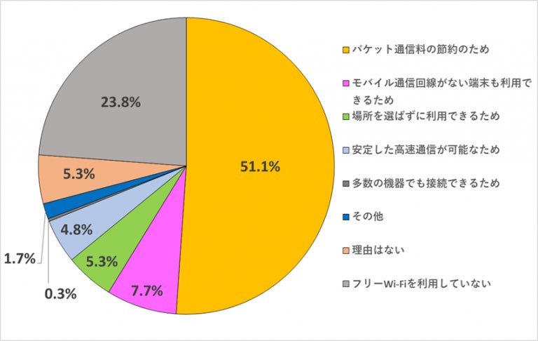 フリーWi-Fiを活用する理由は、「パケット通信料の節約のため」が51.1%と一番多い結果になりました。2人に1人が通信料の節約という回答をしていることがわかりました。前問にあるフリーWi-Fiの利用場所にも影響していますが、やはり通信料を節約のために、利用しているようですね。