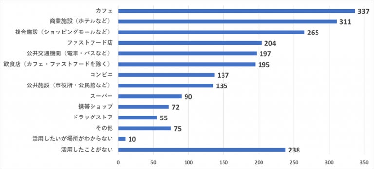 どのような場所でフリーWi-Fiを使っていますか?という質問に対しては、「カフェ」と回答した方が回答数337で最も多くなりました。次いで、「商業施設」と回答した方が回答数311となりました。やはり、「カフェ」や「ホテルなどの商業施設」のような滞在時間が長くなる場所では、通信料の節約などでフリーWi-Fiを利用するかもしれませんね。