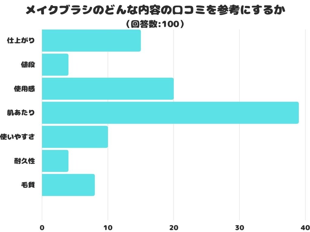 メイクブラシのどんな内容の口コミを参考にするかをアンケートにて調査したところ、1位は「肌あたり」でした。