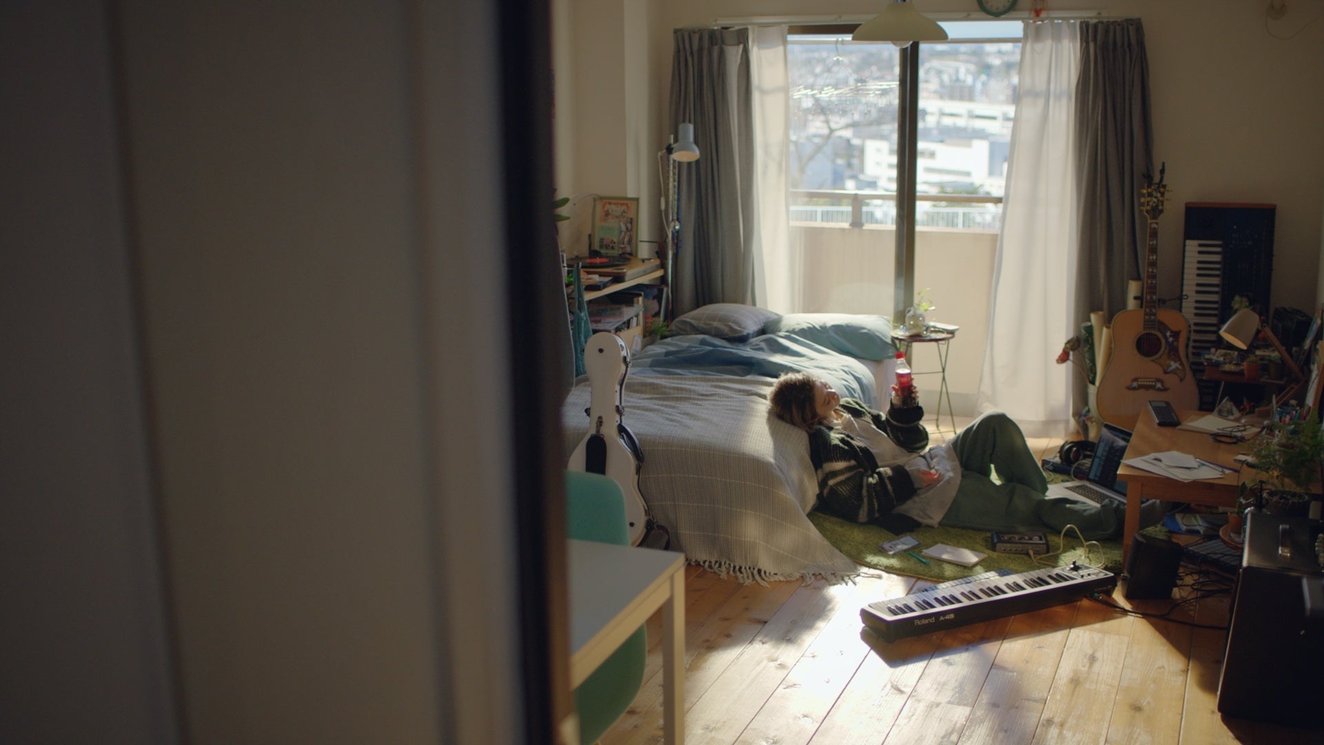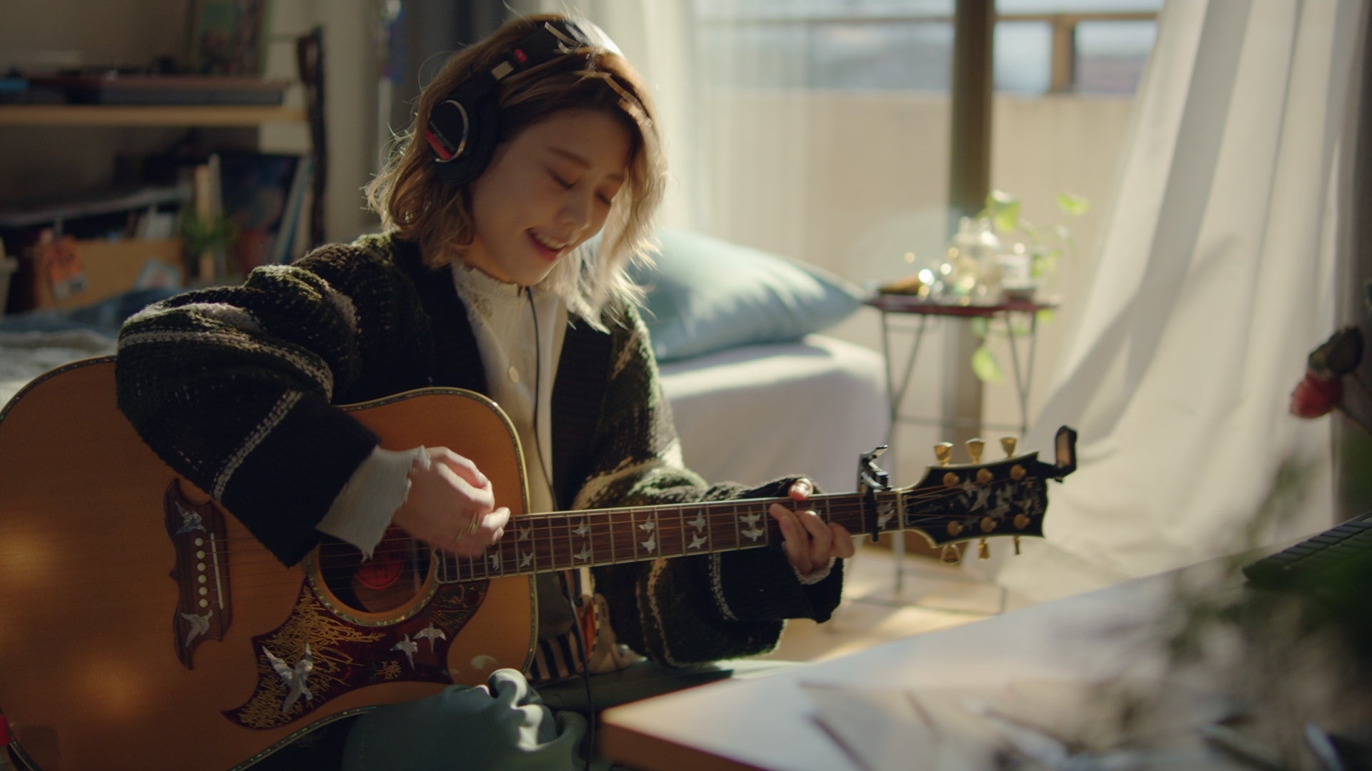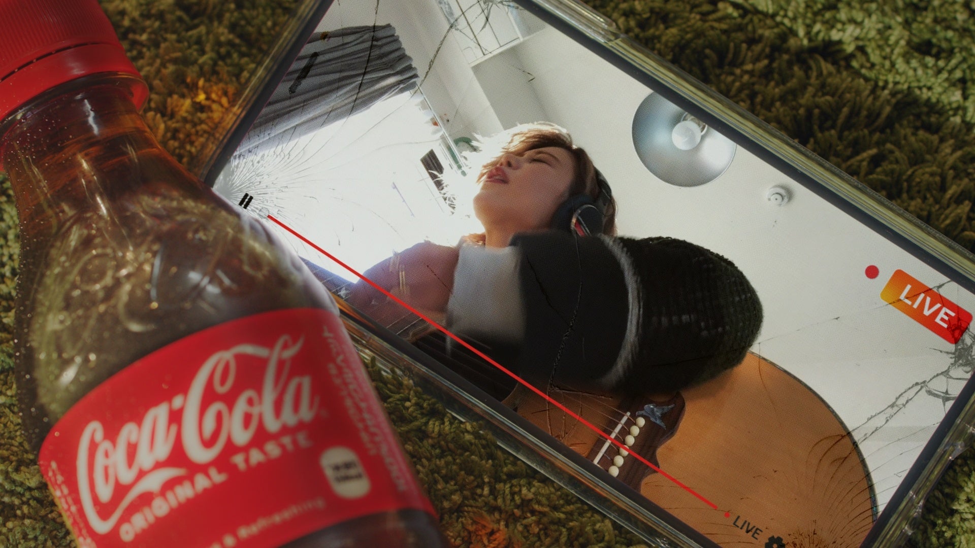 目の前のギターを手に取り、チューニング後、歌い始めるロザリーナさん。ギターを弾いていると、偶然そばにあった「コカ・コーラ」のボトルがスマートフォンの画面に倒れ、Live配信のスイッチがオンに。彼女の歌唱シーンが生配信され始める。