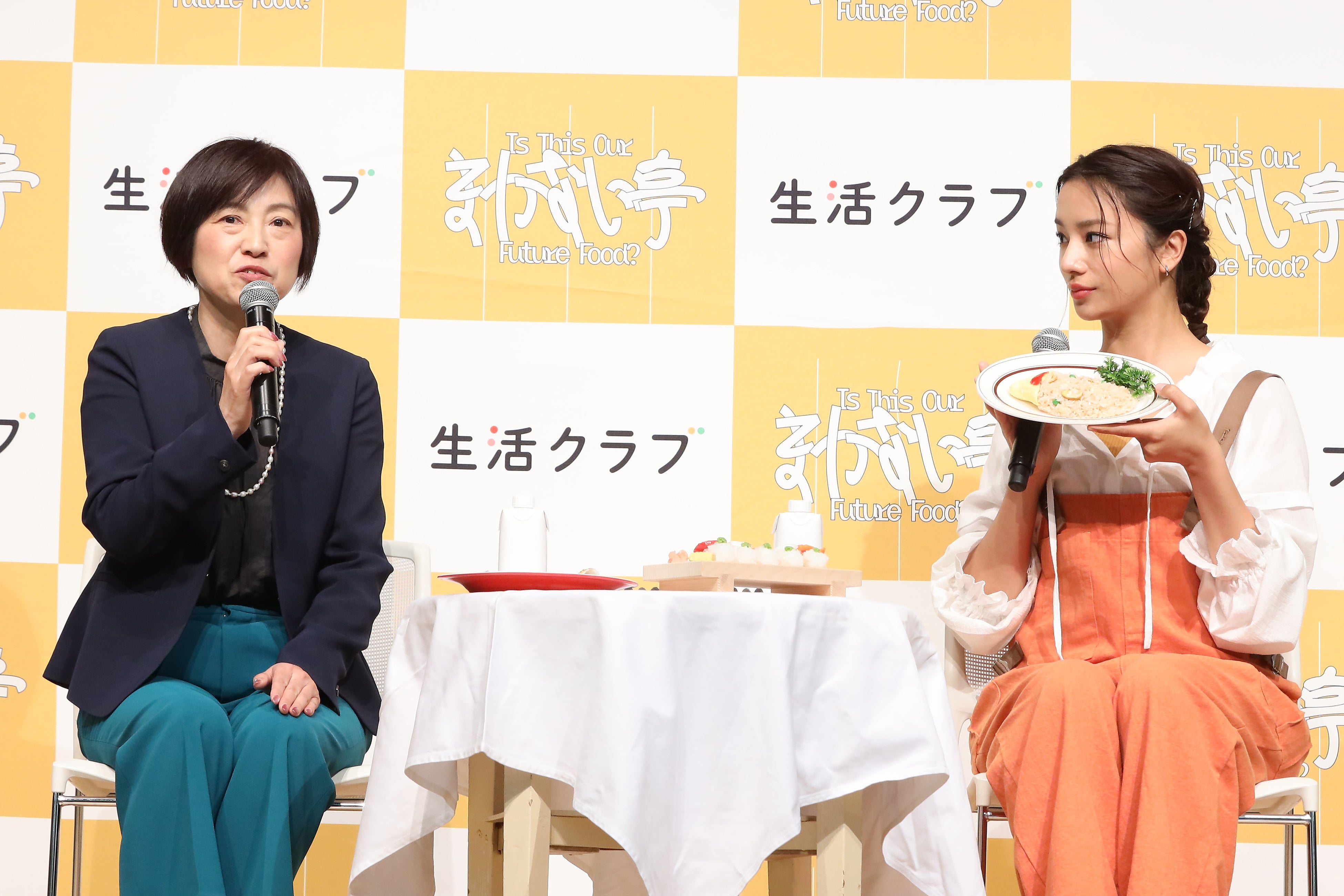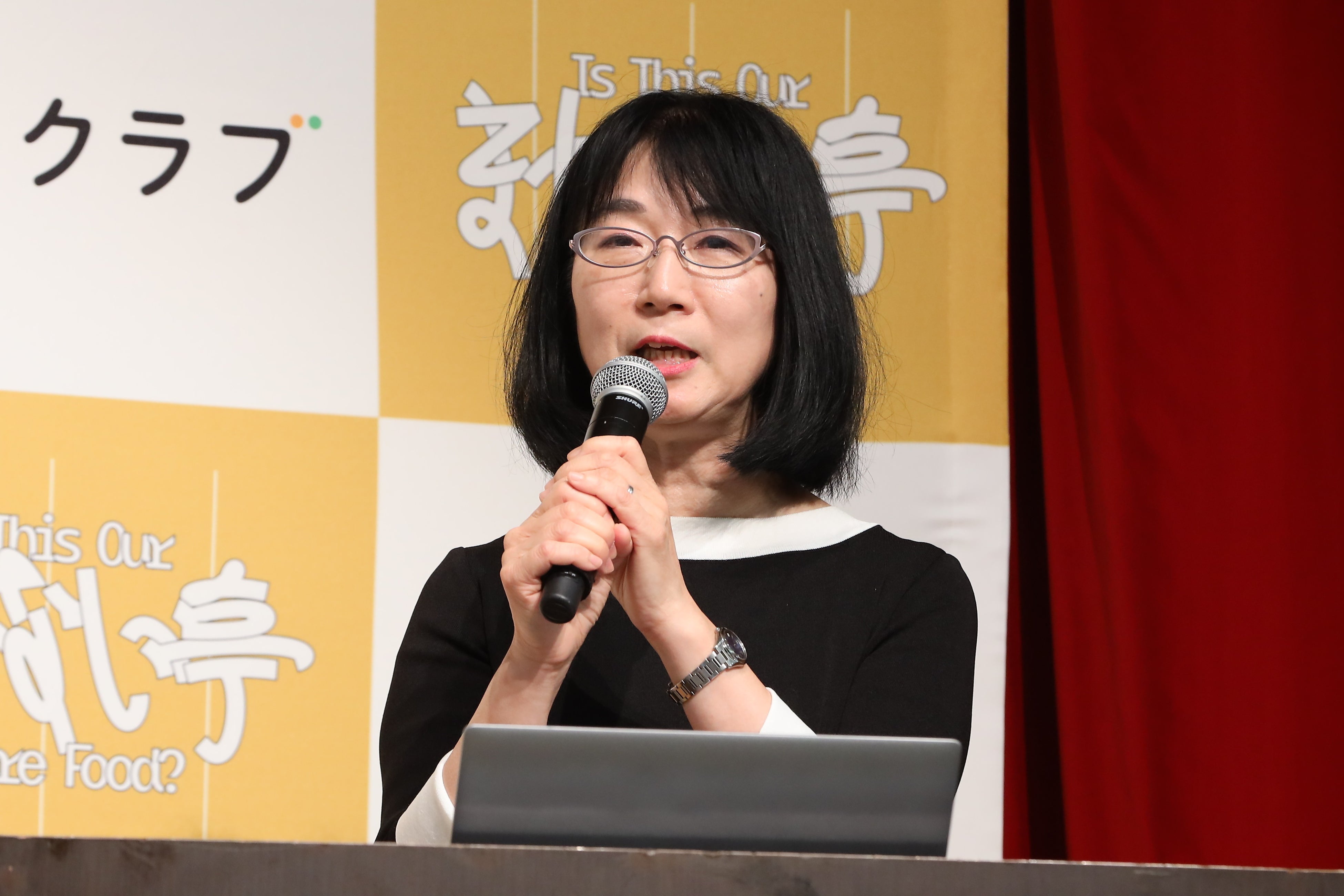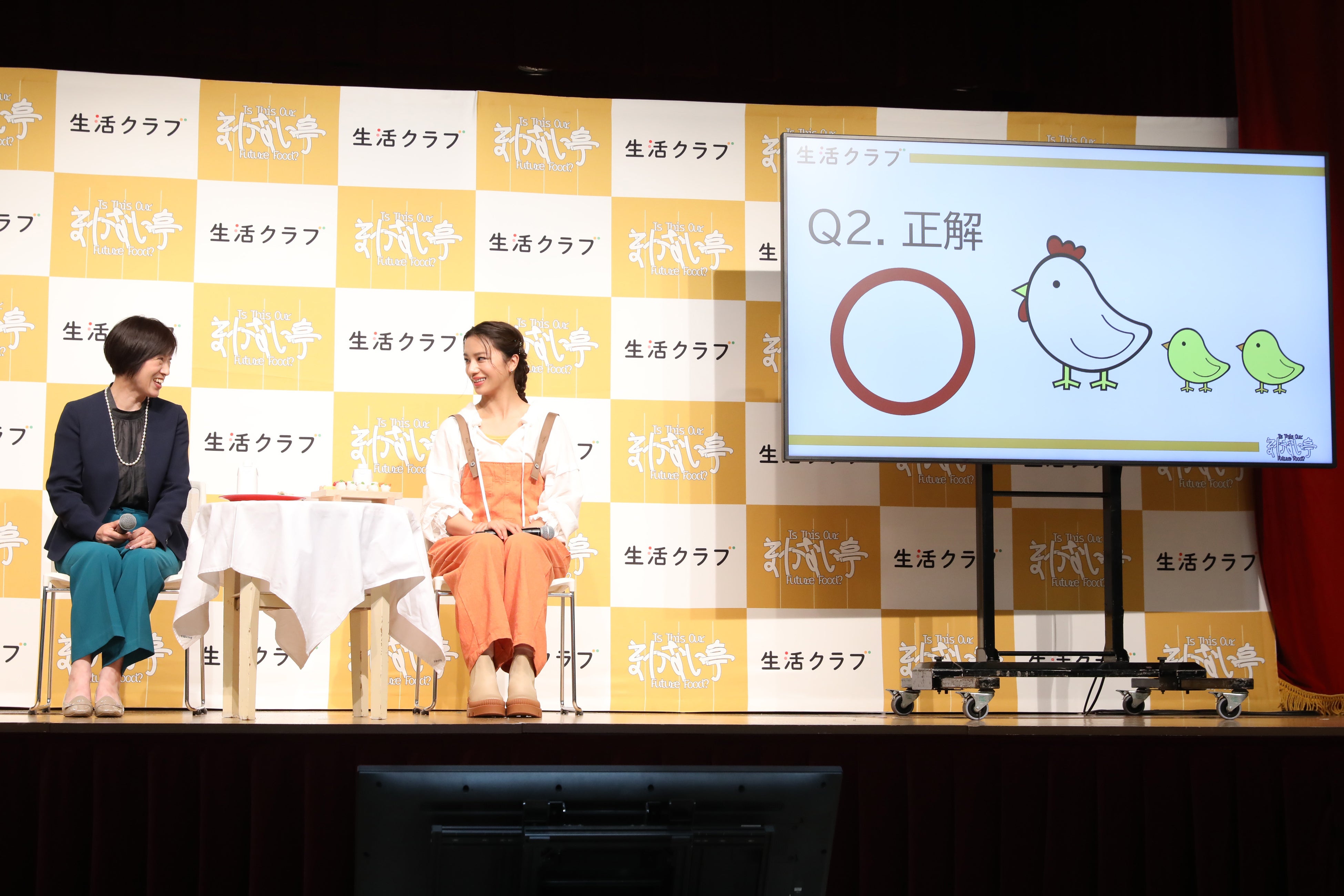 日本の食料自給率について考え、「共感(自分ごと化)」できる機会を創出すべく制作された「国内自給 まかない亭」動画を全員で視聴した後、生活クラブの福住理事と高橋さんとのトークセッションが行なわれました。福住理事からは「食料自給率が38%と聞いても、具体的なイメージがつきにくいかと思います。そこで今回の動画では食料自給率をお料理にして“見える化”しました。そして国産を大切にしている生活クラブにも興味を持ってほしいという思いで制作しました。」と動画の解説がありました。食料自給率を反映し、不完全な姿となった食品サンプルを目にした高橋さんも「すごい!特にオムライス!卵は国産が多いと思っていたのに、ほぼチキンライス.ですね・・・」と驚きの表情。また動画をふまえ、今後の食料自給率の向上についても「自分ができることから、たとえば自分の買い物も投票であるという気持ちで選んでいきたいです。毎日継続していきたい。そして私ができることは発信すること。素晴らしい取組みがあることなどを伝えていきたい。」と意気込みを語ってくださいました。