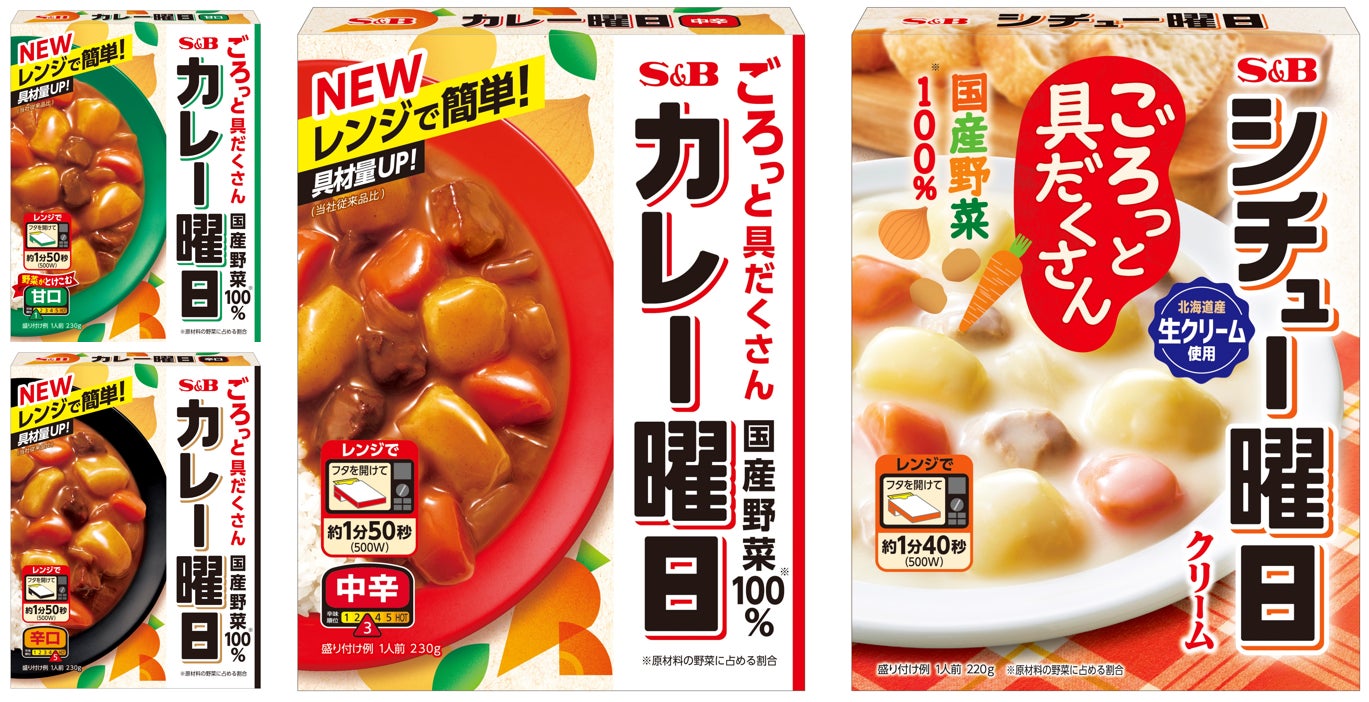 ごろっと具だくさんのレトルトカレー 使用野菜は国産100%※ 「カレー曜日(甘口・中辛・辛口)」「シチュー曜日 クリーム」8月14日 リフレッシュ ※原材料の野菜に占める割合