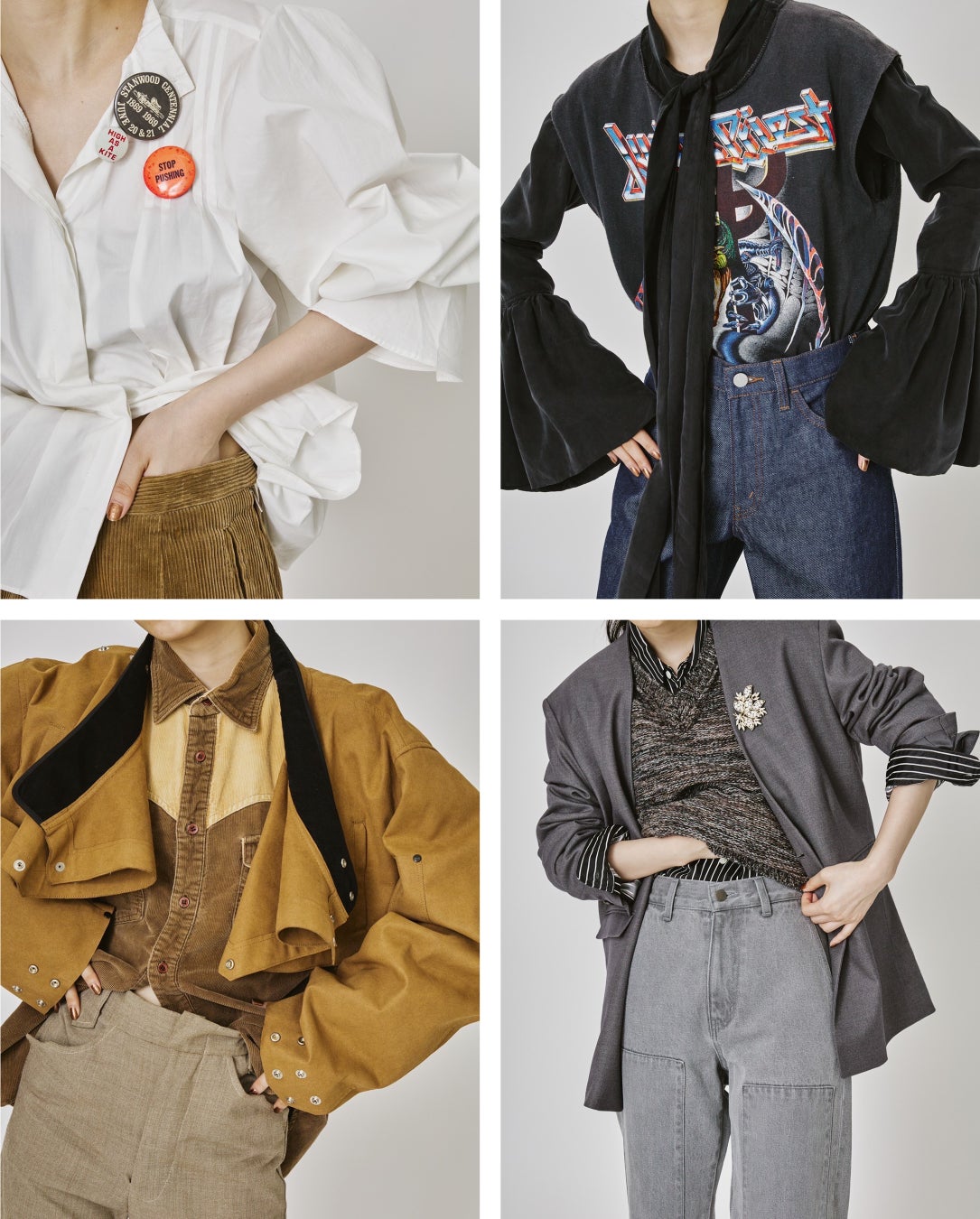 1stシーズンは、デニムに合わせたモダンな着こなし提案として、ジャケットやベストなどのモードなアイテムと、反対に、ビンテージから着想を得たブラウスやスウェットといったカジュアルなアイテムも並びます。モダンビンテージというキーワードを軸に、オリジナルアイテムに合わせてビンテージアイテムを加えることで、自由に着こなしてもらいたいというブランドの想いを表現したスタイリングです。