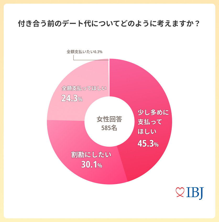 “付き合う前”のデート代について女性は「少し多めに支払ってほしい(45.3%)」が最多に。「割勘にしたい(30.1%)」「全額支払ってほしい(24.3%)」では5.8ポイント差と大差はありませんでした。