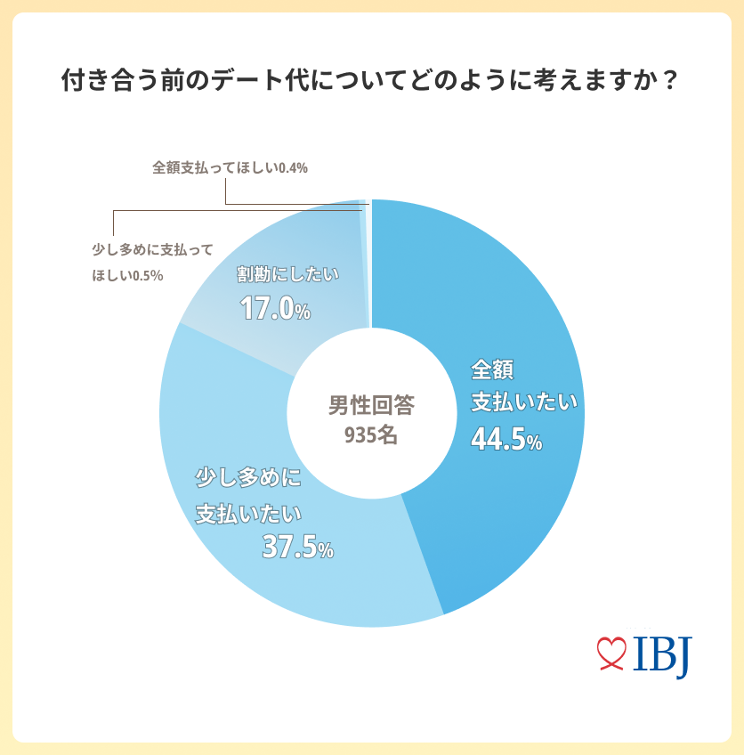 “付き合う前”のデート代について「全額支払いたい(44.5%)」「少し多めに支払いたい(37.5%)」がボリュームゾーンに。