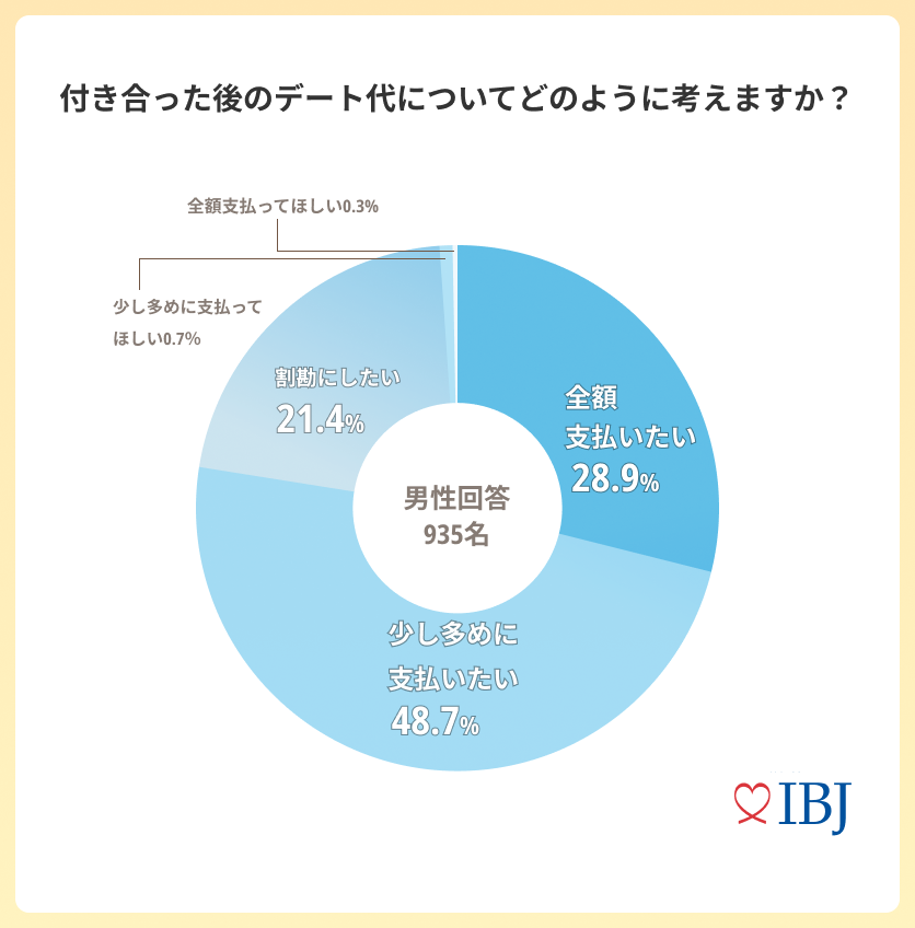 “付き合った後”のデート代について「少し多めに支払いたい(48.7%)」が最多に。「全額支払いたい」は28.9%となり、“付き合う前”と比べると15.6ポイント減少しました。