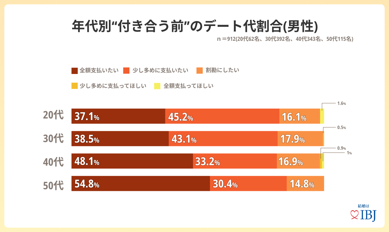 “付き合う前”のデート代について、男性の4割は「全額支払いたい」と回答。特に、40~50代では半数が「全額支払いたい」と回答。