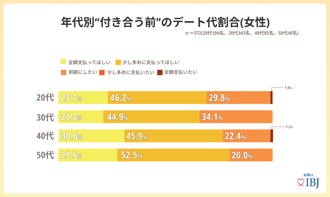 年代別では、40~50代女性の3割は「全額支払ってほしい」と回答し、それ以外の年代では2割程度に。また全年代で「少し多めに支払ってほしい」と回答した割合が最多となり、女性は必ずしも「全額支払ってほしい」という考えではないことが分かりました。