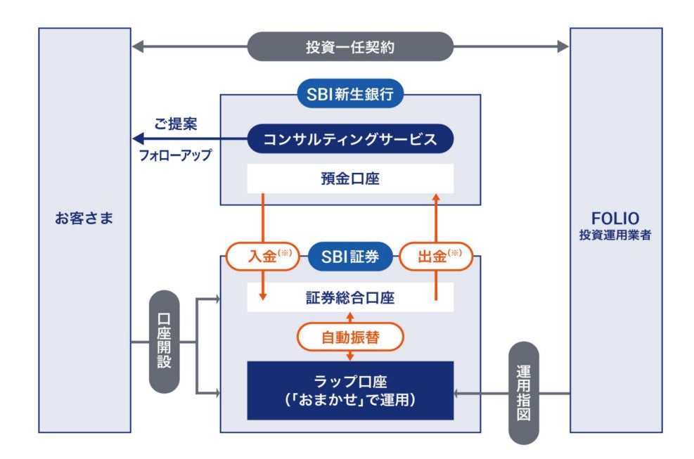 SBI新生銀行とSBI証券は、2022年8月9日(火)より金融商品仲介業務での提携を開始し、2022年10月20日(木)から投資一任サービス「SBIラップ×SBI新生銀行」を提供してまいりました。「SBIラップ×SBI新生銀行」は、お客さまのリスクの許容度合いに応じて5つの運用スタイルから最適なポートフォリオを選択できるサービスです。FOLIOが提供する「4RAP」という投資一任プラットフォームの特性を活かし、SBI証券の金融商品仲介口座を通じてお客さまにサービス提供しています。