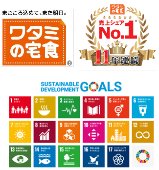 「ワタミの宅食」は、日替わりのお食事と“まごころ”をお届けすることで“社会を支えるインフラ”となることを目指し、事業を展開しています。お弁当・お惣菜は、お客さまと同じ地域に住む“まごころスタッフ”がお届けしています。“まごころスタッフ”がお客さま宅をおとずれることで、日々のコミュニケーションを生み出すとともに、283の自治体(2022年5月現在)と「見守り協定」を締結するなど、高齢者世帯の見守りにも貢献しています。毎日約24万食のお弁当・お惣菜をお届けしており、病者・高齢者食宅配市場「売上シェア11年連続 No.1」※(2010年~2020年)を達成しています。2020年3月には、業界として初めて、自社弁当容器を回収し、新たな容器としてリサイクルする取り組みを全国に展開するなど、SDGsの目標達成にも貢献しています。