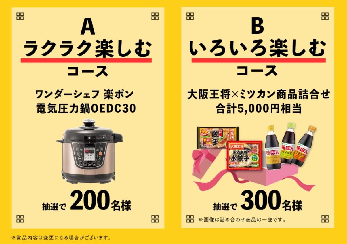 大阪王将ブランドの冷凍食品、味ぽんブランドのぽん酢各種のうち、対象商品を合計4点以上(各社商品1点以上)ご購入いただくと、抽選で500名様に豪華賞品が当たります。