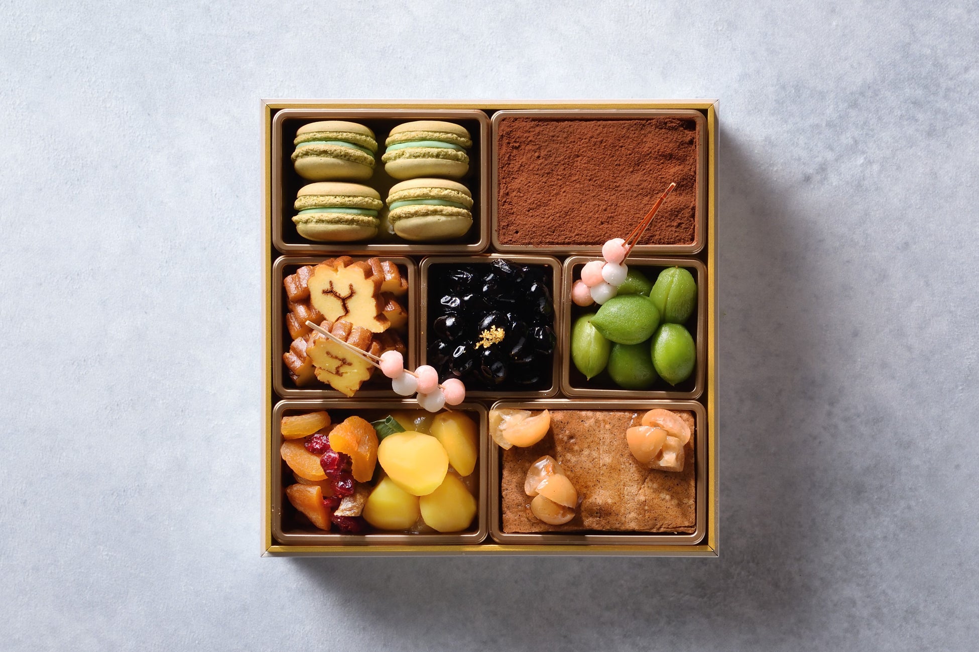 至極のティラミス/そのぎ茶のマカロン/金柑と紅茶のパウンドケーキ/メープル香る伊達巻/丹波ぶどう豆 赤ワイン味/若桃甘露煮/栗きんとんとドライフルーツ