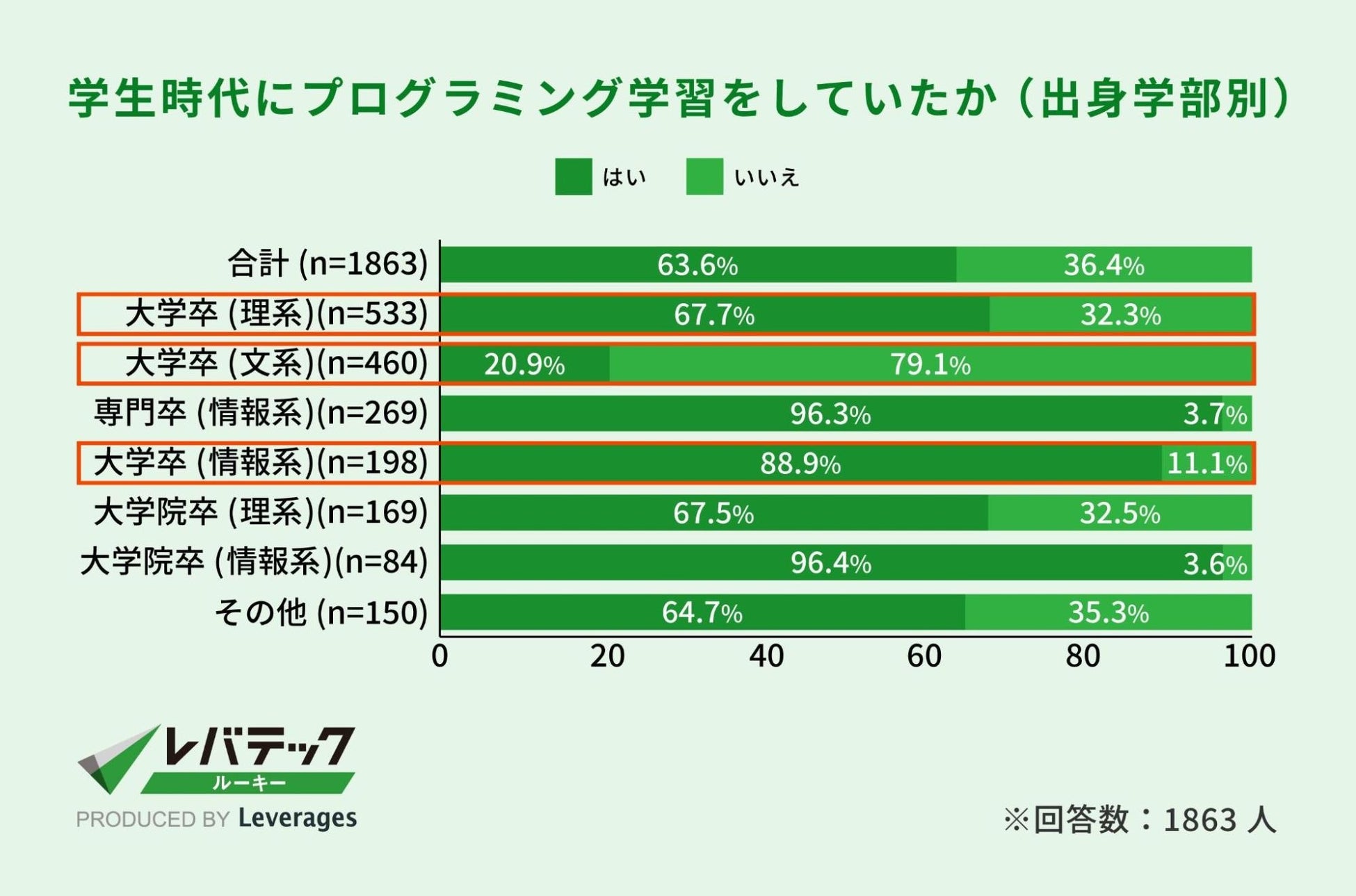 新卒でエンジニアになった人のうち、学生時代にプログラミング学習をしていた人は約6割です。文系学部の出身者でも、約2割が「学生時代に学習していた」と回答しました。出身学部に限らずプログラミングを学習している人がいることが分かります。