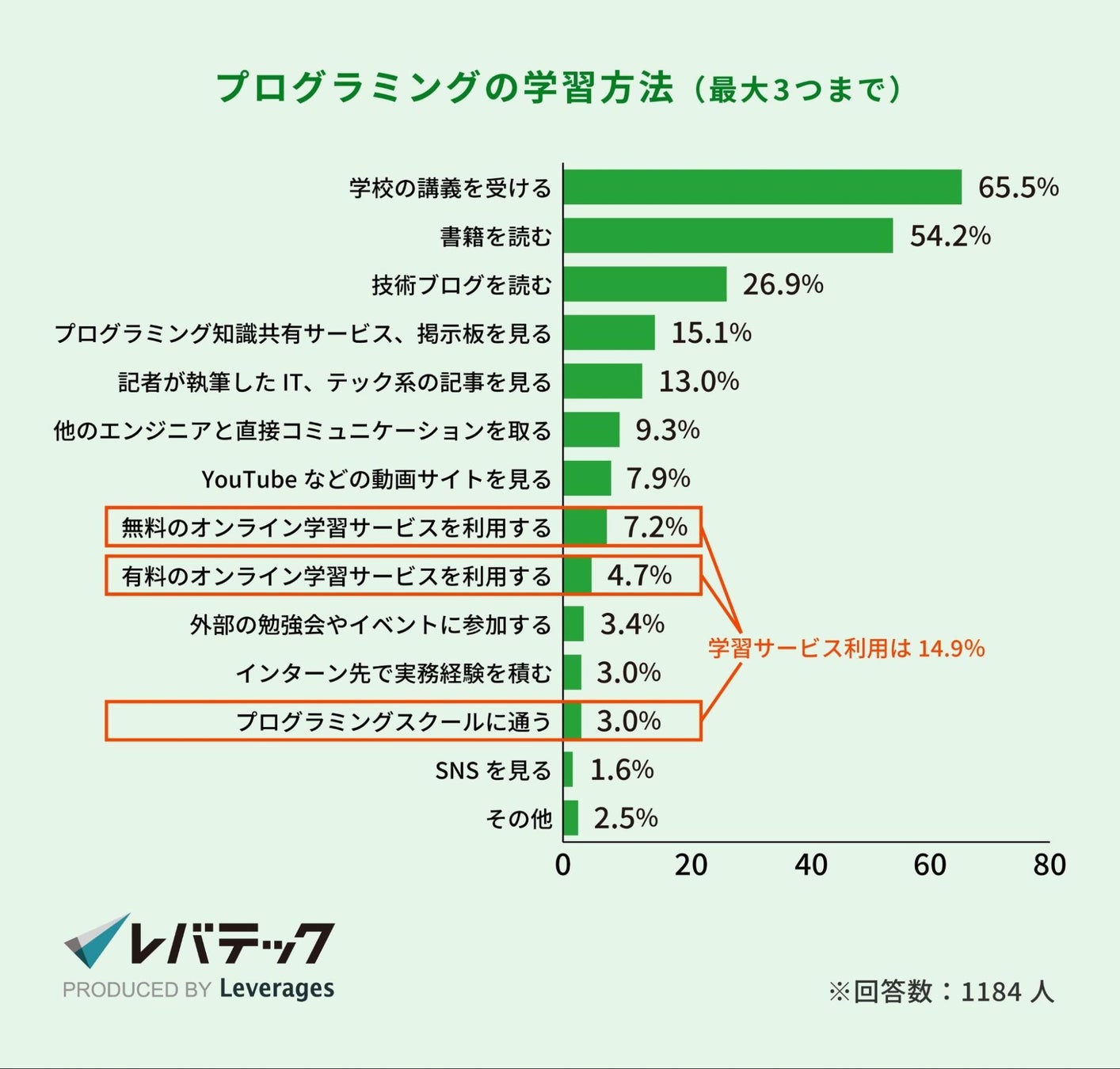 3.学生時代のプログラミングの学習方法、14.9%が学習サービスを利用