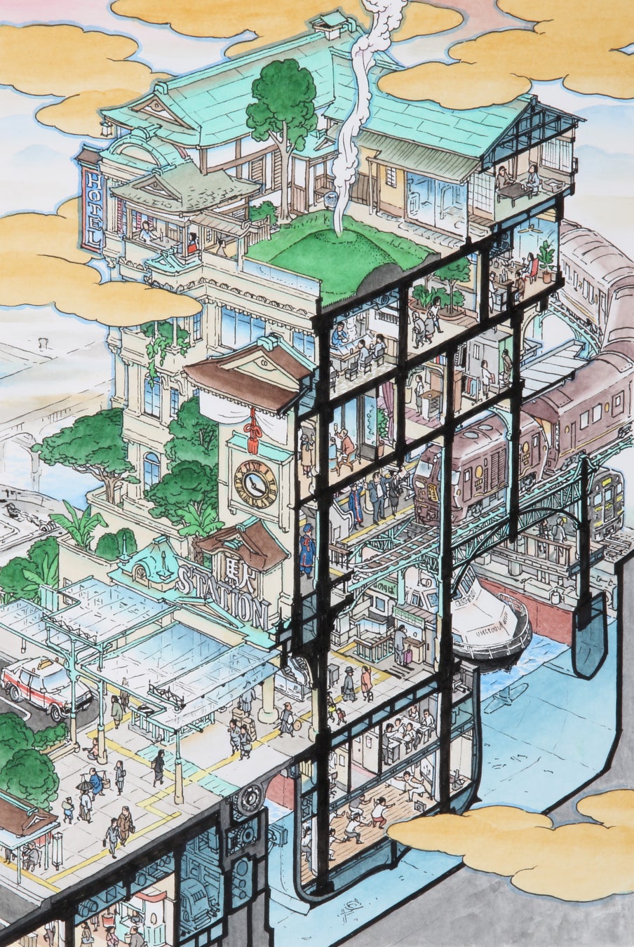 <クレドール>は、1974年に誕生して以来、彫金や漆、螺鈿など、日本の伝統工芸の技術を取り入れたモデルを多く展開し、その全てに匠の精神と卓越した技術が息づいています。一方、山口氏の作品は、大和絵のような俯瞰視点を持ちつつ、圧倒的な細密さと独創性によって建築物や人物を描き込み、唯一無二の世界観を築いています。