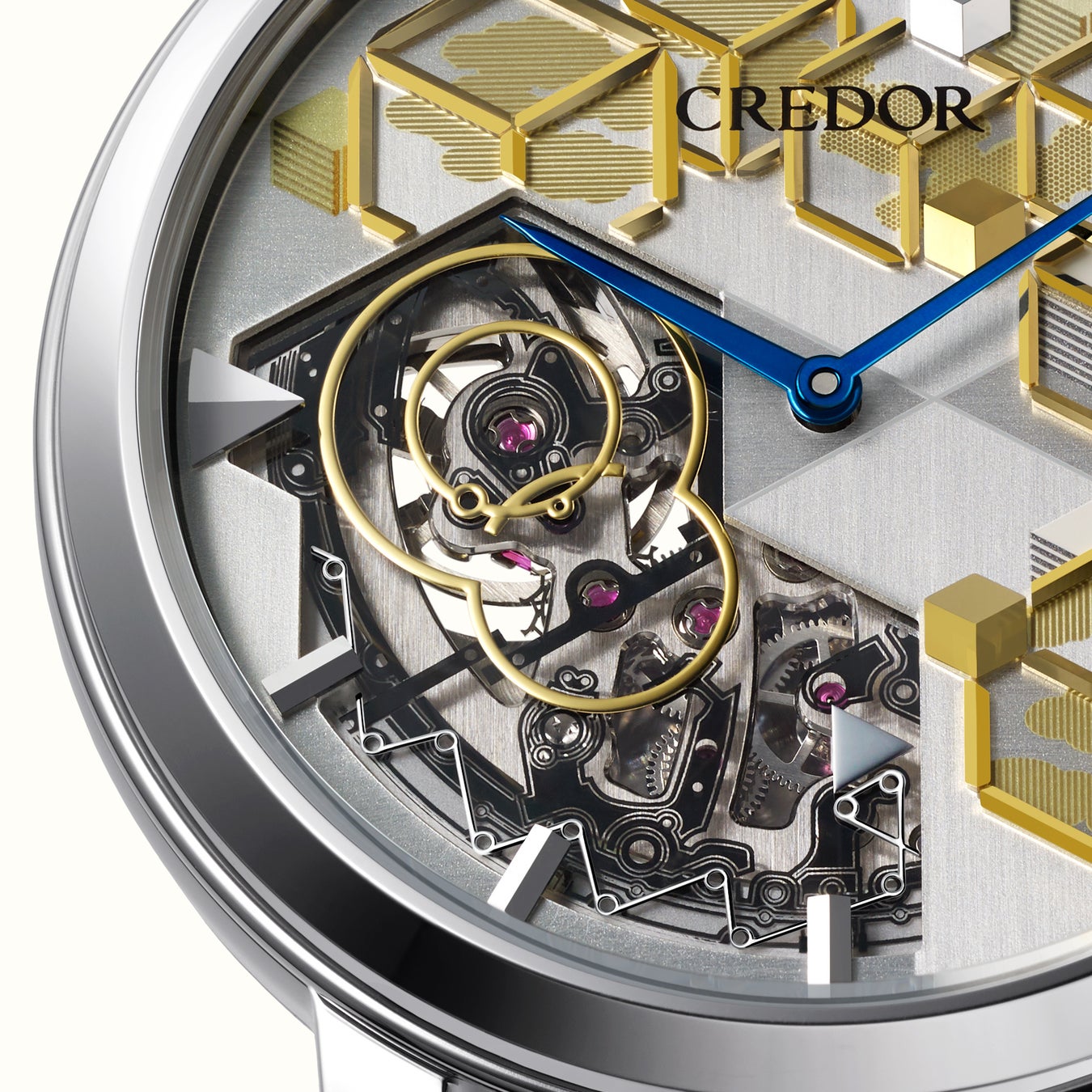 さらに、ムーブメントとダイヤルの間には、一枚の透明なガラスを挟み、ガラスの表面にメカニカルな意匠を取り入れることで、スケルトン部分の機械的な美しさを一層際立たせています。ガラスに様々な技法を施し、二次元と三次元がオーバーラップするようなレイヤー感は、クレドールの過去のモデルから着想を得ました。