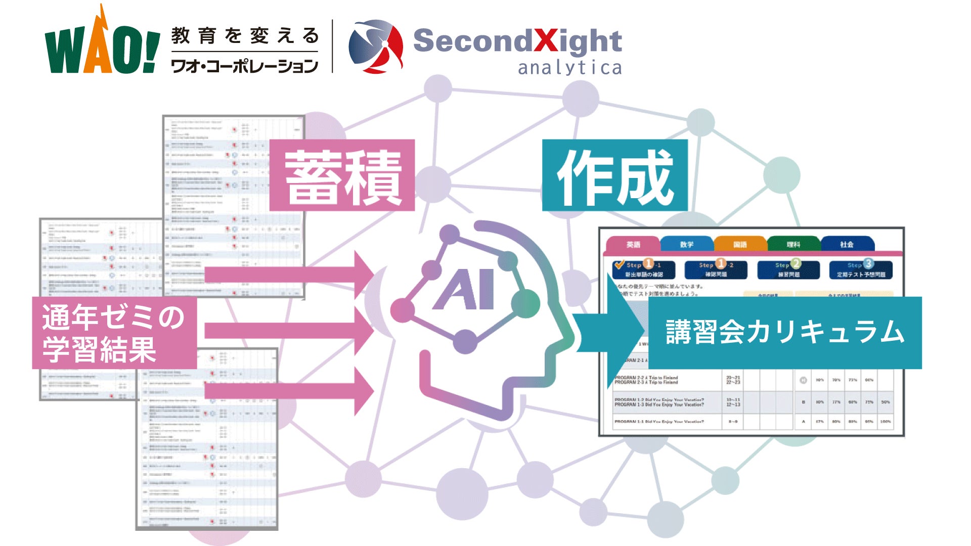 季節講習時には、ワオ・コーポレーションが持つ膨大な成績データを基にして、それまでに蓄積された前学期の生徒一人ひとりの学習履歴をAIが分析します。